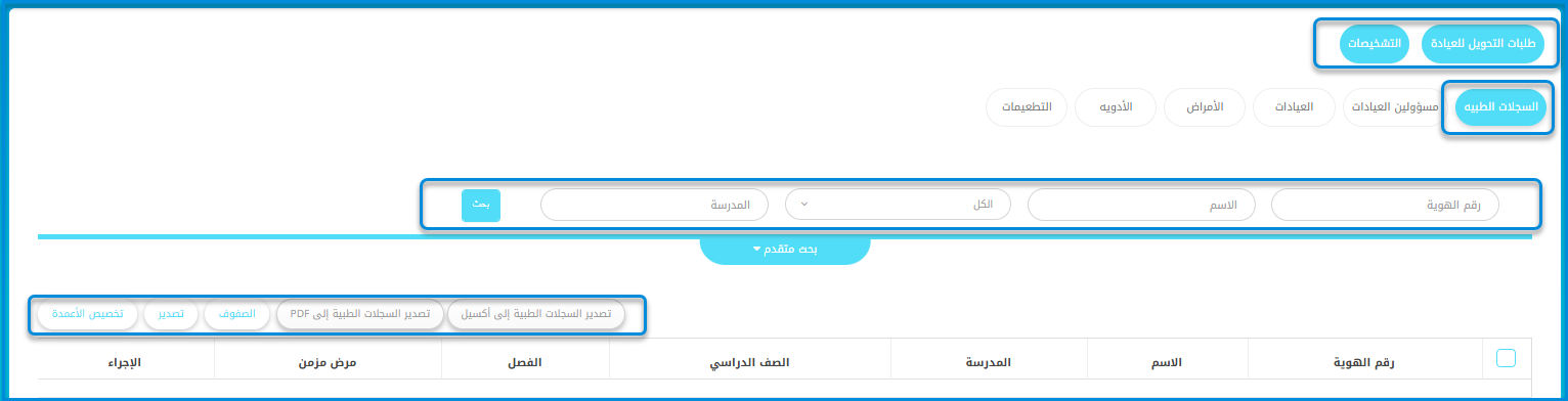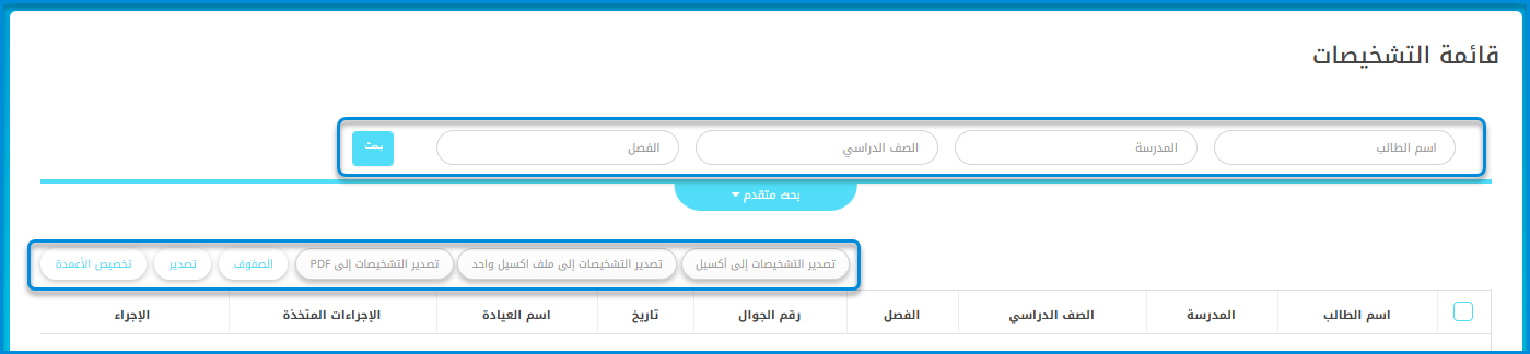 • استخدم حقول البحث للبحث عن تشخيص طالب معين.